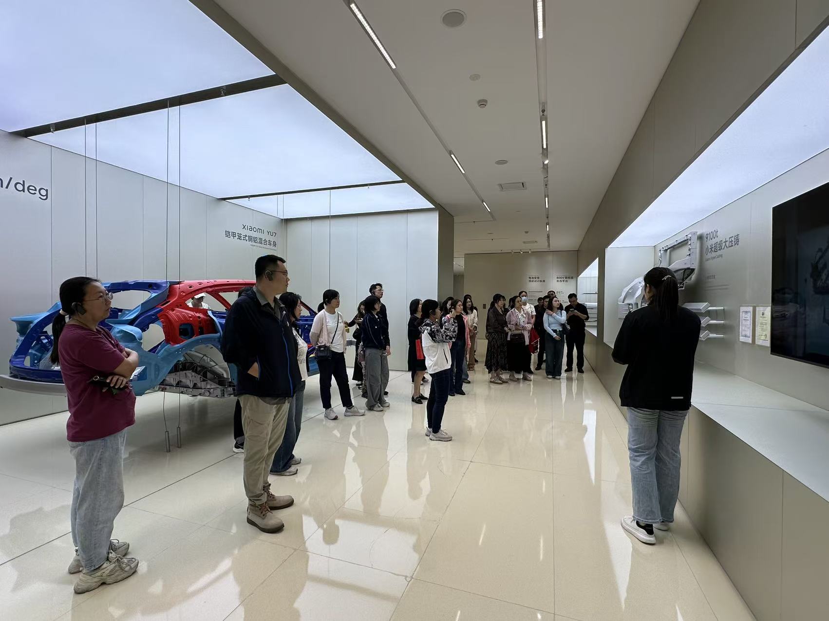 踏入小米汽车工厂,前沿科技感扑面而来。大家首先参观了小米汽车超级工厂的展厅,了解了小米汽车的核心理念、设计逻辑和技术优势,在汽车展厅近距离感受智能制造的魅力;随后,坐上导览车来到了车间参观,亲眼见证了“中国智能”的强大实力,一体化压铸、全自动机械臂……现场那些技艺高超的“钢铁工人”,是中国新能源汽车制造自动化、智能化的生动体现。